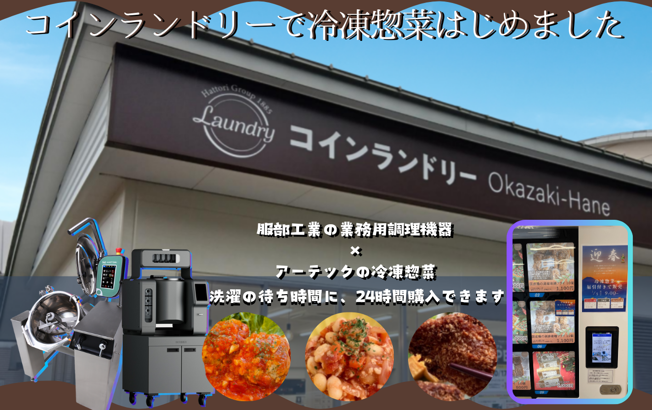 アーテックでは、服部工業グループの新たな取り組みとして、運営するクックチルセンターで調理した冷凍惣菜を、コインランドリー店舗内に設置した冷凍自動販売機にて24時間販売しています。