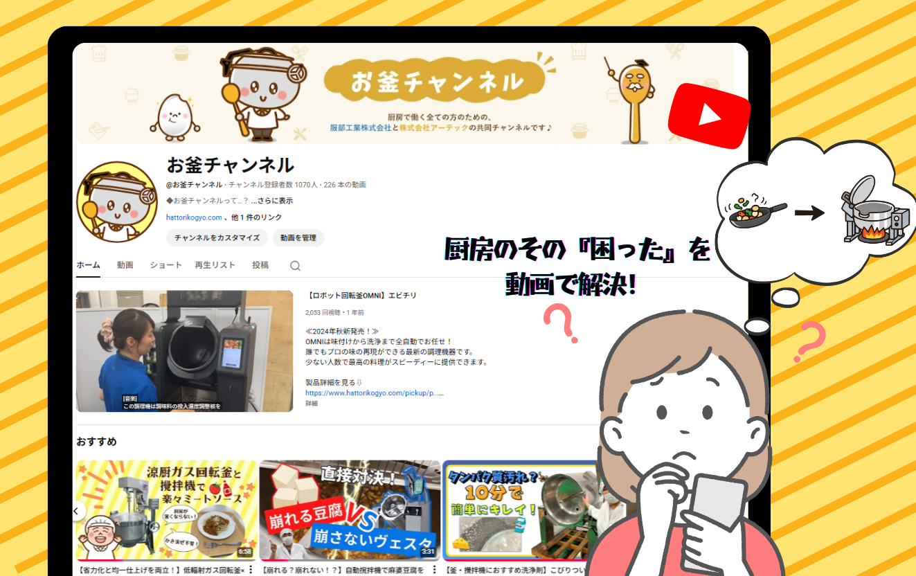 このチャンネルは、厨房コンシェルジュの「株式会社アーテック」と、グループ会社で業務用厨房機器メーカーの「服部工業株式会社」が共同で運営しています。